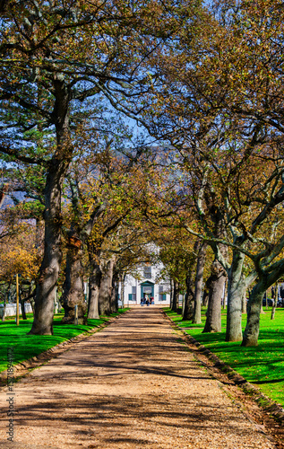 © Arnold, Naklejka premium Vertical shot of Groot Constantia manor framed by tree avenue, Cape Town, South Africa