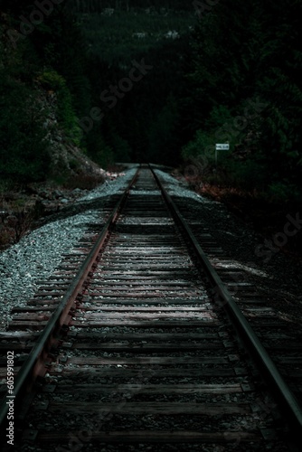Fototapeta premium Vertical shot of railway tracks in a forest