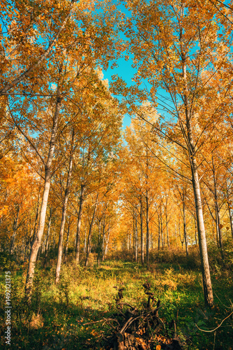© Bits and Splits, Obraz premium Vertical shot of tall aspen trees in forest in autumn