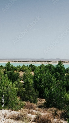 © Wirestock, Naklejka premium Vertical shot of trees growing on a field by a coastline