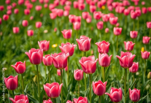 © nuntalee, Fototapeta premium Vertical shot of vibrant pink tulips blooming in a lush spring meadow, field, vibrant