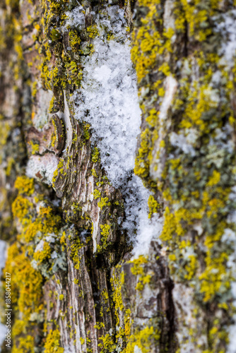 © DH Stock, Obraz premium Vertical Tree Bark with Moss and Snow