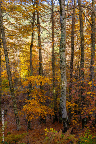 © Haris Andronos, Obraz premium Vertical View of a Deciduous Forest Interior in the Valia Kirna/Samarina, Pindos, Greece, Featuring Pale, Mossy Tree Trunks and Vibrant Golden-Yellow and Orange Autumn Foliage