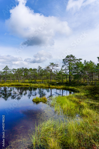 © makasana photo, Obraz premium vertical view of a peat bog and blue lake landscape under an expressive sky with white clouds