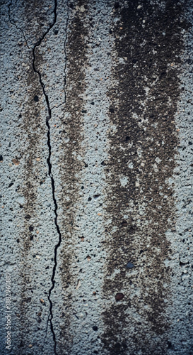 © PhotoArtHub, Obraz premium Vertical view of concrete with crack, showing textured surface and dark stains, representing deterioration, age, or structural issue