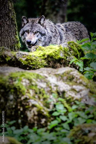 © Willy Mobilo, Naklejka premium Vertical view of European gray wolf in the forest