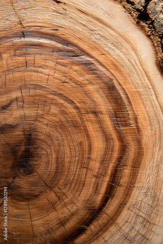 © Анастасия Ареховская, Naklejka premium Vertical view of thick wooden slice with bark edge leaning on beige wall, highlighting raw grain and texture, studio lighting emphasizing natural colors.