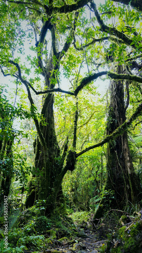 Fototapeta premium Vertical view with forest. Fairy tale spooky looking woods in a misty day....