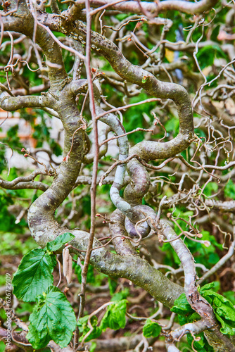 © Nicholas J. Klein, Naklejka premium Vertical wall of thickly twisted an gnarly vines with green leaves background stock photo