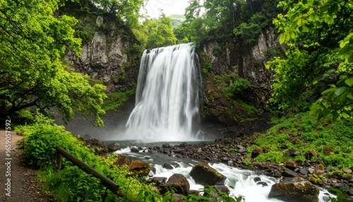 Obraz premium Vertical waterfall plunges down rocky cliff amid dense tropical greenery;...