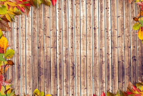 Fototapeta premium Vertical wooden planks showing rustic grain are forming flat design backdrop framing autumn leaves