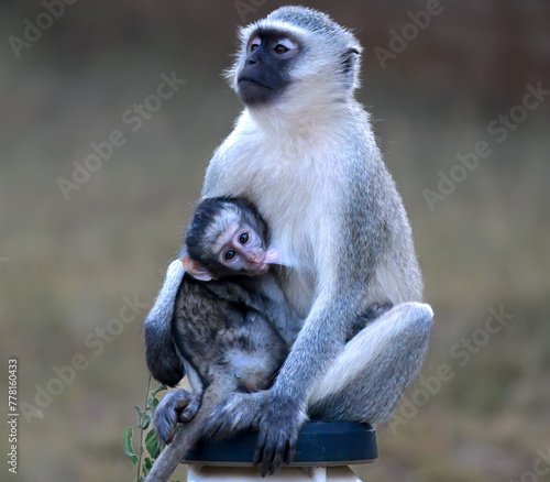 Obraz premium Vervet monkey mother with suckling baby sitting on a camp light post.