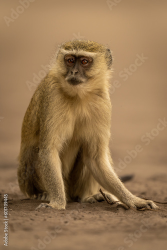 Fototapeta premium Vervet monkey sitting on sand watching camera