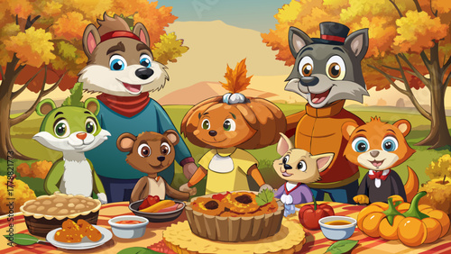 Naklejka premium Very beautiful cartoon family of animals celebrating Thanksgiving with food, pies, and decorations, cheerful autumn background with warm colors and smiling faces.