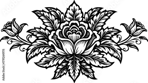 Fototapeta premium Very beautiful intricate black and white engraved floral background for retro design projects, featuring ornate vintage botanical patterns, detailed leaves and blossoms, and elegant linework that evok