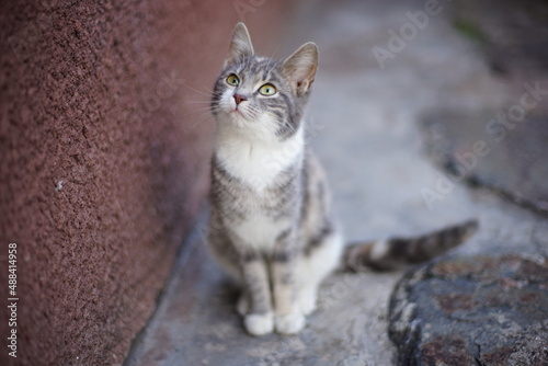 © Omega, Naklejka premium very beautiful tortoiseshell cat sits near the house with a curious look