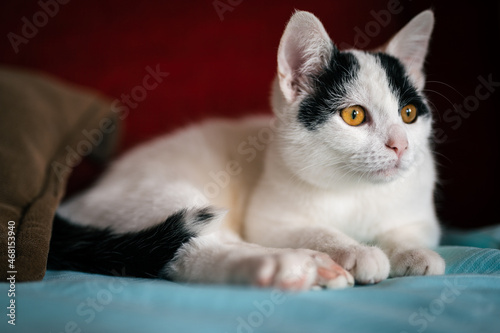 © Robert Petrovic, Obraz premium Very beautiful white kitty comfortably lying on sofa between pillows. Cute kitten with orange eyes.