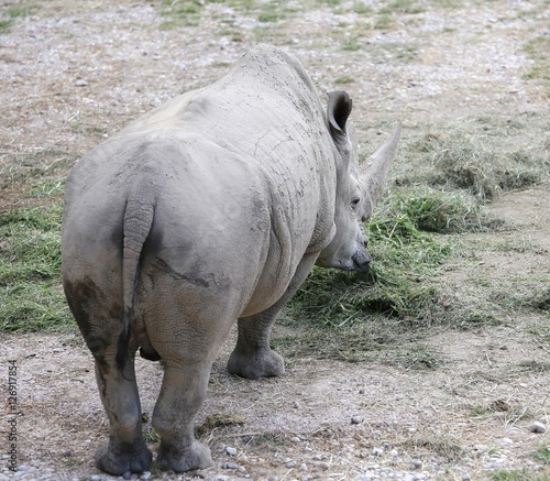 © ChiccoDodiFC, Naklejka premium very big rhino with long horn while grazing the grass