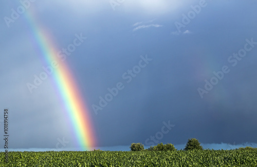 Naklejka premium Very bright rainbow over the fields. Agricultural landscape in eastern...