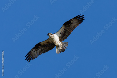 Naklejka premium Very close view of an Osprey (sea hawk) flying in beautiful light, seen in the wild in California.