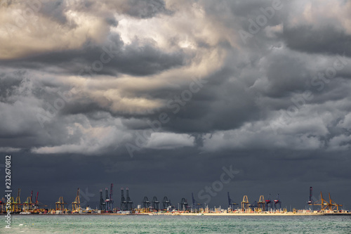 © F.C.G., Fototapeta premium Very dark clouds over commercial dock