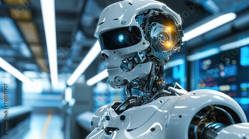 © Curva Design, Fototapeta premium very detailed robot face or technological cyborg head - side view - AI Generated