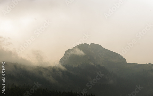 Fototapeta premium Very high mountain in the clouds, peak in the haze, montenegro, panorama