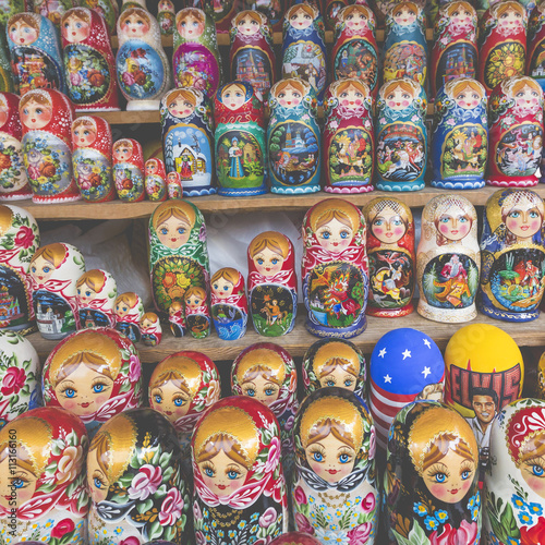 Fototapeta premium Very large selection of matryoshkas Russian souvenirs at the gift shop in Moscow