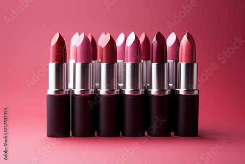 Fototapeta premium Very nice and quality lipsticks lined up on a pink background