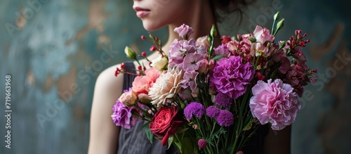 © Ilgun, Obraz premium Very nice young woman holding big and beautiful colourful flower wedding bouquet with purple carnations and mattiolas cream David Austin roses ranunculus and pistachios. Copy space image