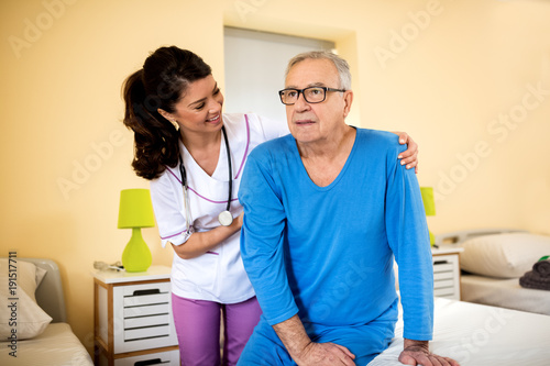 © didesign, Obraz premium Very patient nurse helps old senior man to stand up from bed