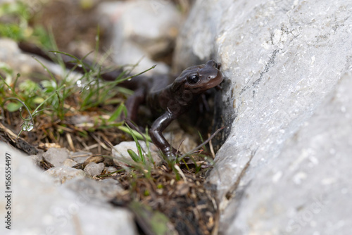 Naklejka premium Very rare brown coloured alpine salamander (Salamandra atra) found in the Austrian Alps in Tyrol