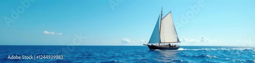 Fototapeta premium Vessel sails in blue open sea with white foam, ships, vessel