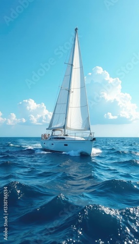 Naklejka premium Vessel sails in blue open sea with white foam, water, weather