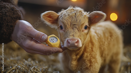 © THUA, Fototapeta premium vet checks calf temperature with thermometer in barn