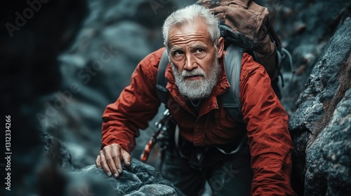 © Pannin, Fototapeta premium Veteran climber with a rugged appearance, holding onto rocks while searching for his next foothold.