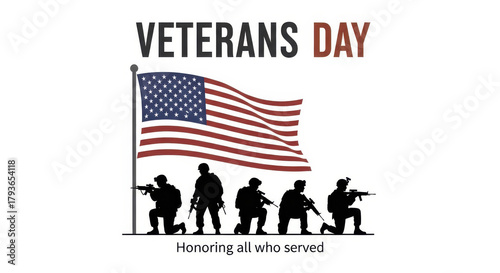 Obraz premium Veterans Day Banner Honoring All Who Served with US Flag and Soldiers...
