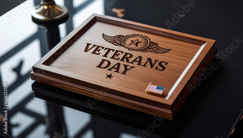 © Muhammad, Naklejka premium Veterans day wooden box with american flag and engraving to honor military personnel who have served in the united states armed forces on veterans day isolated on black background