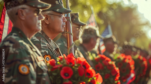 © spyrakot, Obraz premium Veterans Honoring Memorial Day with Poppy Wreaths in Patriotic Parade Setting