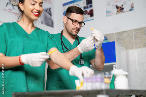 © zorandim75, Obraz premium Veterinarian preparing injection for dogs.