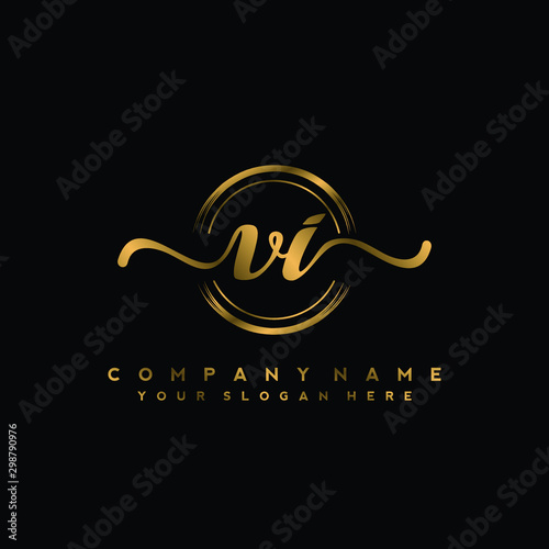 Fototapeta premium VI Initial handwriting logo design with golden brush circle. Logo for...