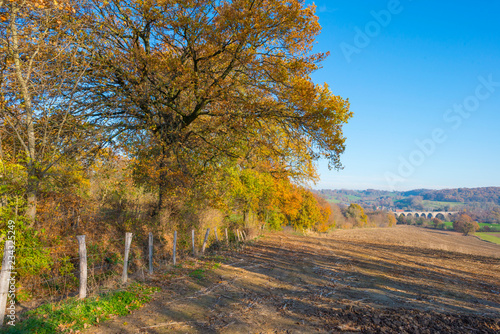 © Naj, Naklejka premium Viaduct with a railroad over a valley in sunlight at fall