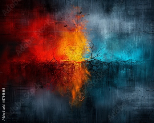 Fototapeta premium Vibrant abstract art with fiery red, yellow, and cool blue tones blending...