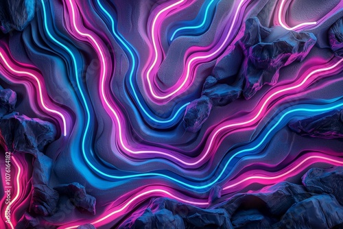 Obraz premium Vibrant Abstract Background of Neon Lights Creating Colorful Waves and Lines Over Dark Surface with Textured Elements for Modern Design Projects