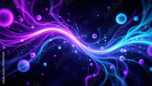 Fototapeta premium Vibrant abstract background with purple and blue neon-like waves and floating bubbles.
