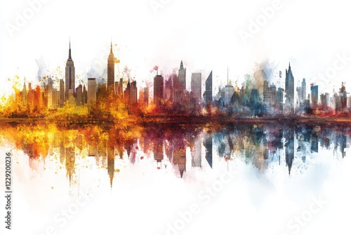 © Cik In, Obraz premium Vibrant Abstract City Skyline with Colorful Reflections on Water Creating a Dreamlike Urban Landscape in a Contemporary Art Style