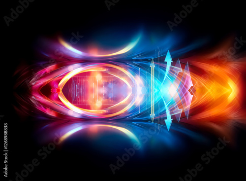 © joeycheung, Obraz premium Vibrant abstract design featuring luminous blue, orange, and red flowing shapes against a dark backdrop, creating a dynamic and energetic visual effect with central arrows.