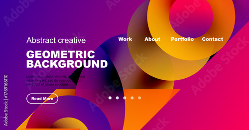 © antishock, Fototapeta premium Vibrant abstract design. Geometric shapes, purple, magenta, yellow hues dominate composition. Text elements present, website mockup style.