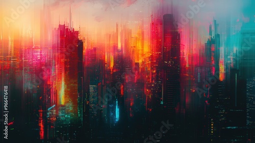 Fototapeta premium Vibrant abstract digital cityscape at sunset with neon lights and futuristic atmosphere.