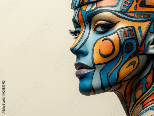 © Kittipong, Naklejka premium Vibrant Abstract Face Painting Closeup on Blue and Orange, Mysterious Beauty Concept with Soft Lighting, Fashion Editorial Artistry